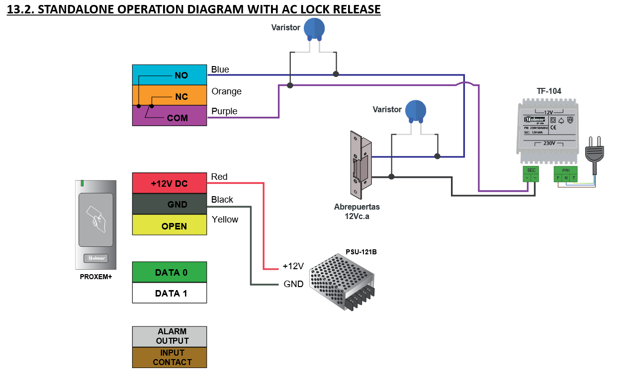3. Golmar препоръчва използването на постояннотокова ел.магнитна брава, тъй като свързването на променливотокова такава може да генерира високо напрежение, което да повреди устройството. Ако го направите, защитете оборудването, като поставите варистор на изхода на релейния контакт и друг - паралелно на ел.м.брава. Вижте схемите.