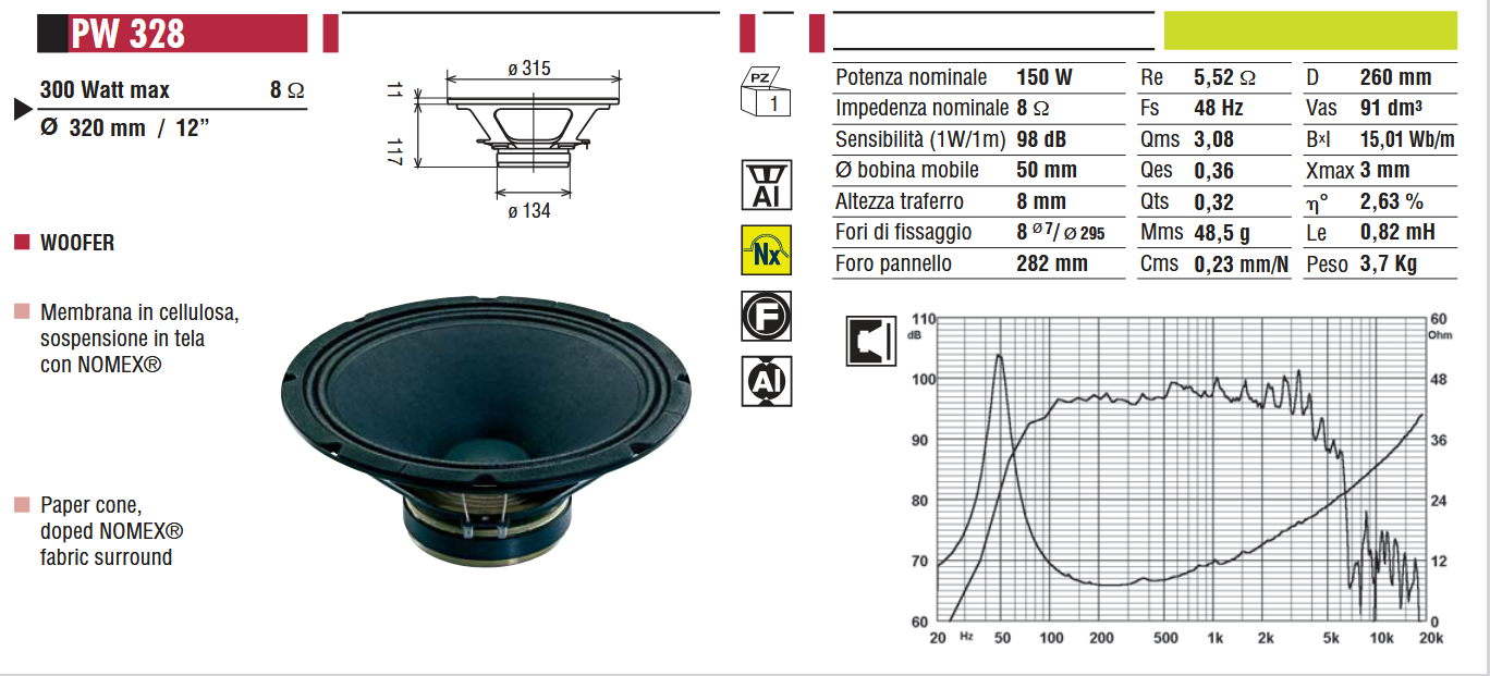 32 cm ( 12" ) Нискочестотен говорител на CIARE с целулозна мембрана и платнено окачване с NOMEX.